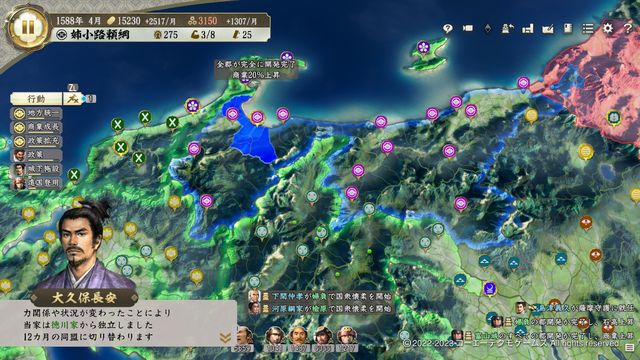 パッと見では姉小路家がカモに見えるが、開幕で徳川家が姉小路を従属させてしまううえ、1ヶ月後の小牧長久手イベントで秀吉と徳川が和睦してしまうため手が出せない。