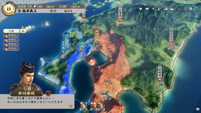 開幕で迎撃されないが陥落不可能な陣容で高山城を包囲すれば降伏し、小城の加治木城だけになる。