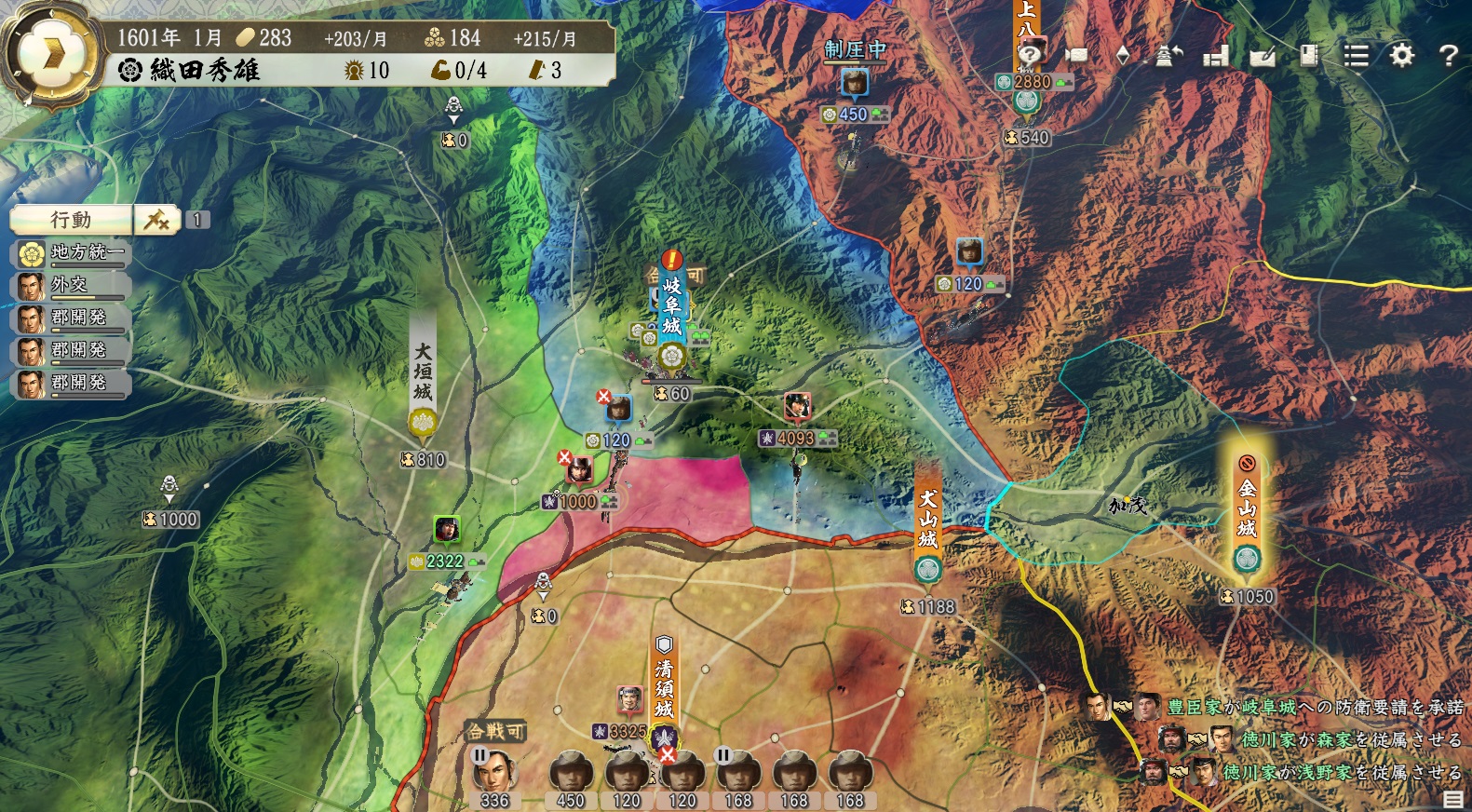 豊臣家との同盟が残っていて保護(攻城予約)できないので、小松城+金沢城(攻城戦)でおとなしくさせることに。
