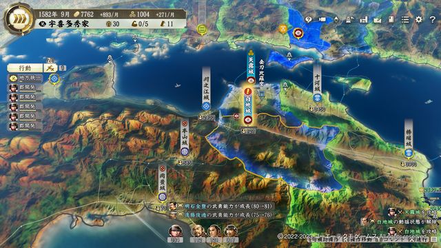 次は天霧城の金刀比羅宮を威風で確保できるのが理想で金銭収入が跳ね上がるが、ここは運が絡む。