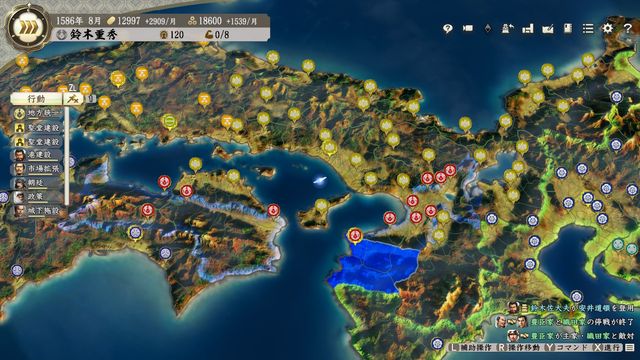 勢力の西側に本拠が寄っており統治範囲外の城が多めになるため豊臣の金銭収入は普段よりやや少ない。