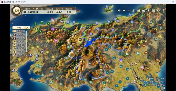 しばらく内政を行ったのち豊臣戦となるが、東側の状況を見ながら時期を判断しよう、上杉が従属吸収されていなければゆっくり内政を行っていても問題はないが