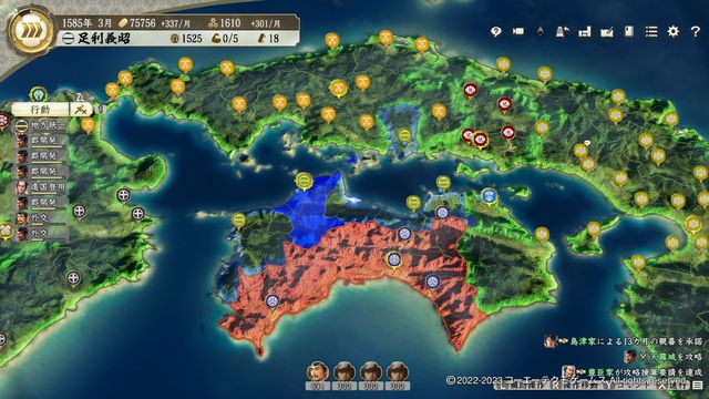 このあたりで豊臣とは同盟を結べるようになるので同盟を結んでおき、毛利家との同盟が切れた段階で拡大されないように攻城予約をかけつつ毛利家を滅亡させよう