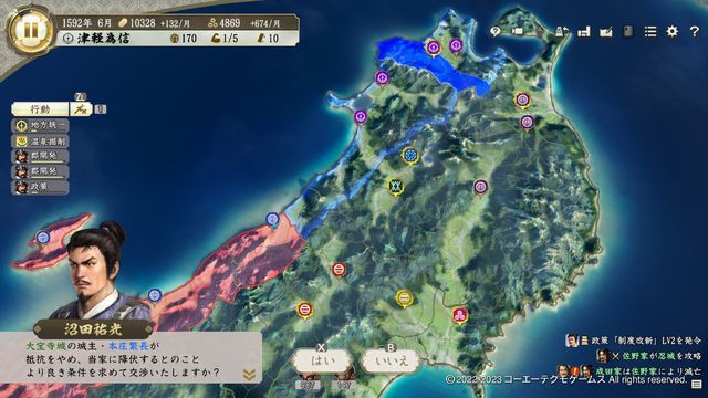 攻略後は浪岡のどちらかを代官配置し、合戦などで勲功を稼がせなるべく早く昇進させ浪岡の固有政策を発令したい。