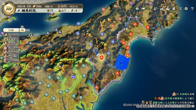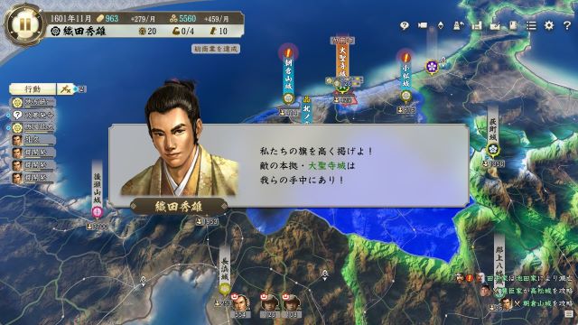 二度目の威風大を発動できれば忍城や河越等の大兵力の城も手に入るのでそこへ主軸を移せば後はひたすら威風起こしつつ西進となる。