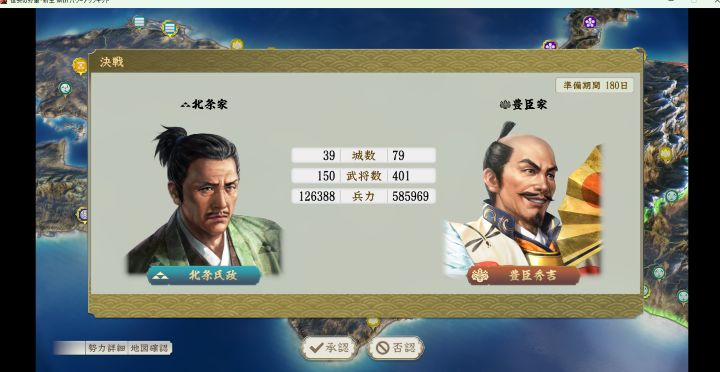 開始3年が過ぎると豊臣が従属吸収でどんどん大きくなるため、可能な限り西進して豊臣と正式に開戦したい
