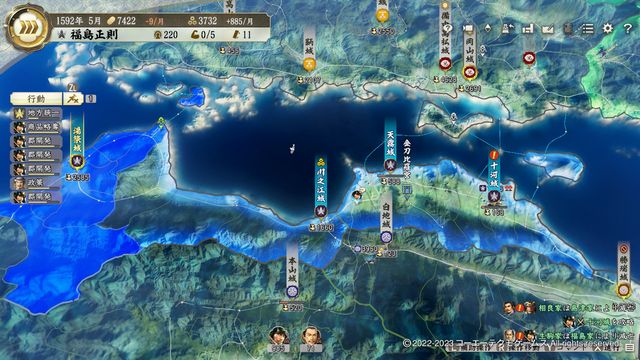 毛利は武将もそこまで強くないため、基本的には豊臣や宇喜多・小早川などにネコババされないように注意しながら、彼らの進路を塞ぐように攻め入っていくだけである。