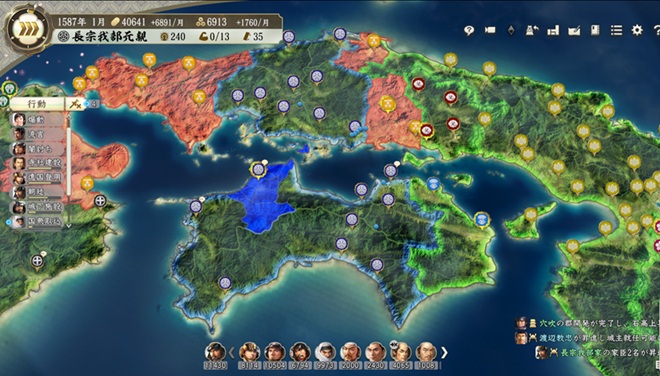 長宗我部は「兵役増強・優」を家宰にするため兵糧収入-40%となり、2回ほど出陣すると兵糧不足でほぼ動けなくなる。