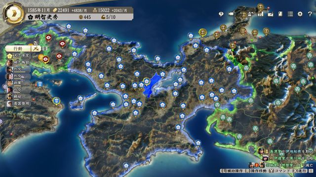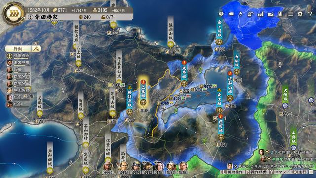 近畿東部の城は後々の織田戦・北条戦・徳川戦で使うので城下方針「進軍」で開発した方が良い。