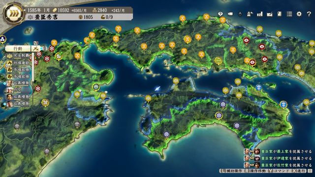 九州での戦闘は腰兵糧の問題のため参戦可能なのがほぼ四国の城のみ、本拠移転しないと秀吉も参戦できず合戦できない。