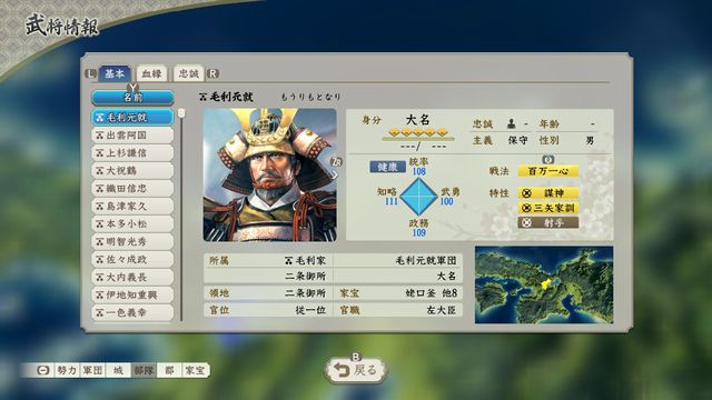 優秀な家臣団、高性能毛利家一門、そして毛利元就の固有政策:百万一心之訓による武将忠誠心加算により、安定した内政および行軍が可能。