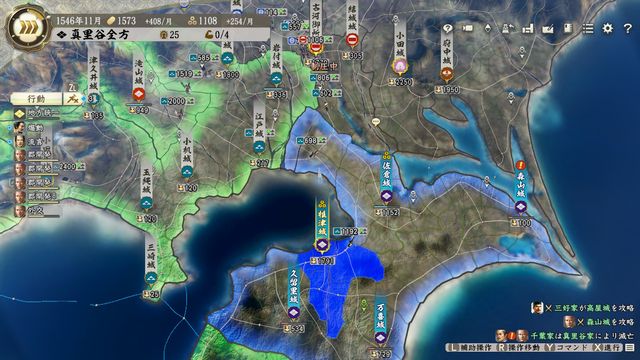 4城になった時点で那須・千葉・真里谷が従属し、さらに本拠の石高を少し伸ばせば佐竹も従属する。