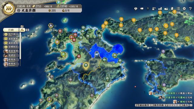 大友の名将は島津戦で必須なので、長宗我部は岡豊1城にしたら従属させるか大友を滅ぼすまで放置。