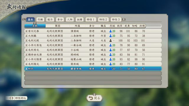 「一門武将の能力経験値増加(2倍)」という独特の効果を持つ毛利元就の固有特性「三矢家訓」に着目し、有能な一門武将の育成プレイも可能。