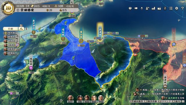 序盤全体を通して、兵数2000の国衆は侵攻防止の生命線なので、一切被害を受けないように動かす。