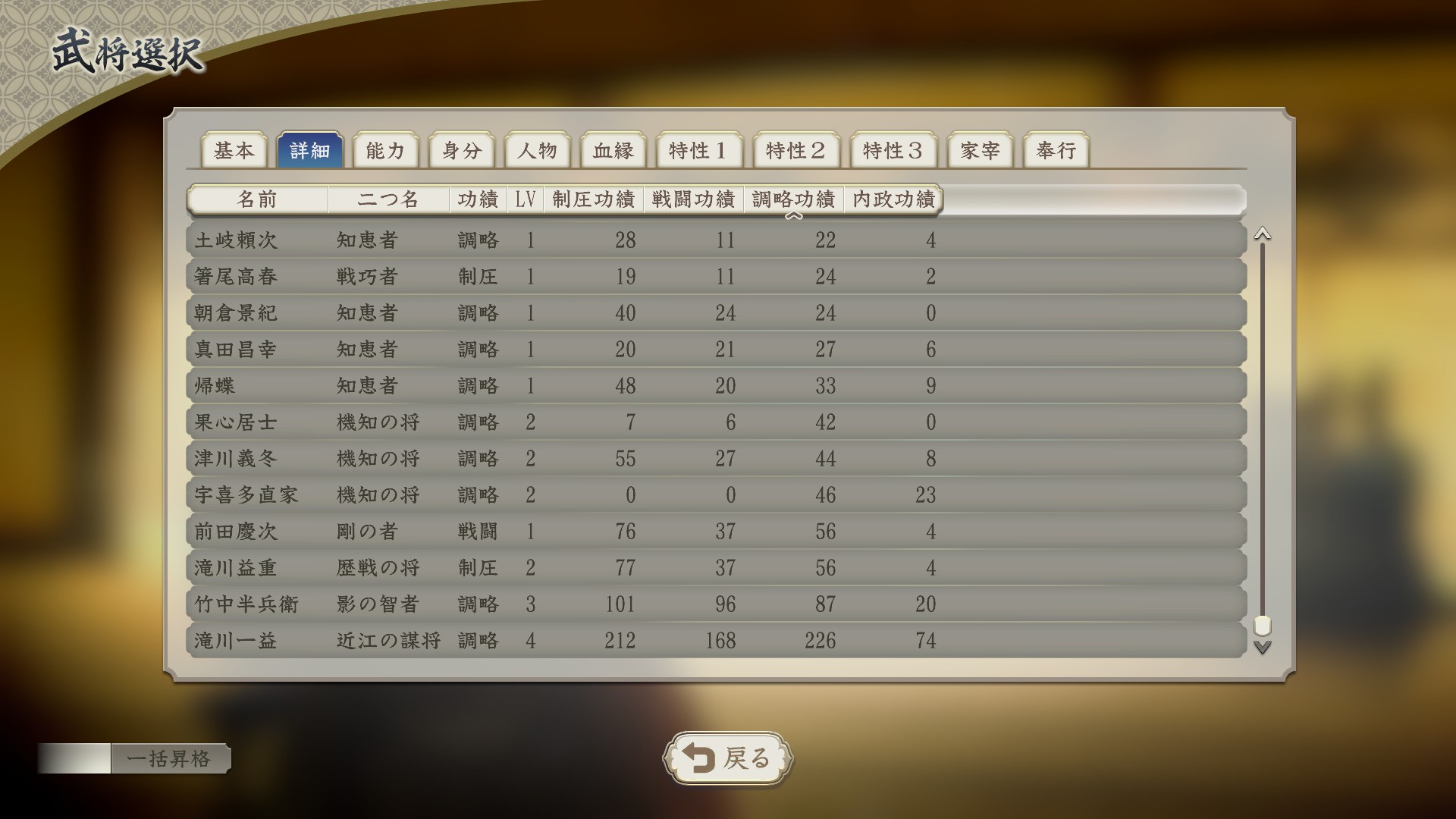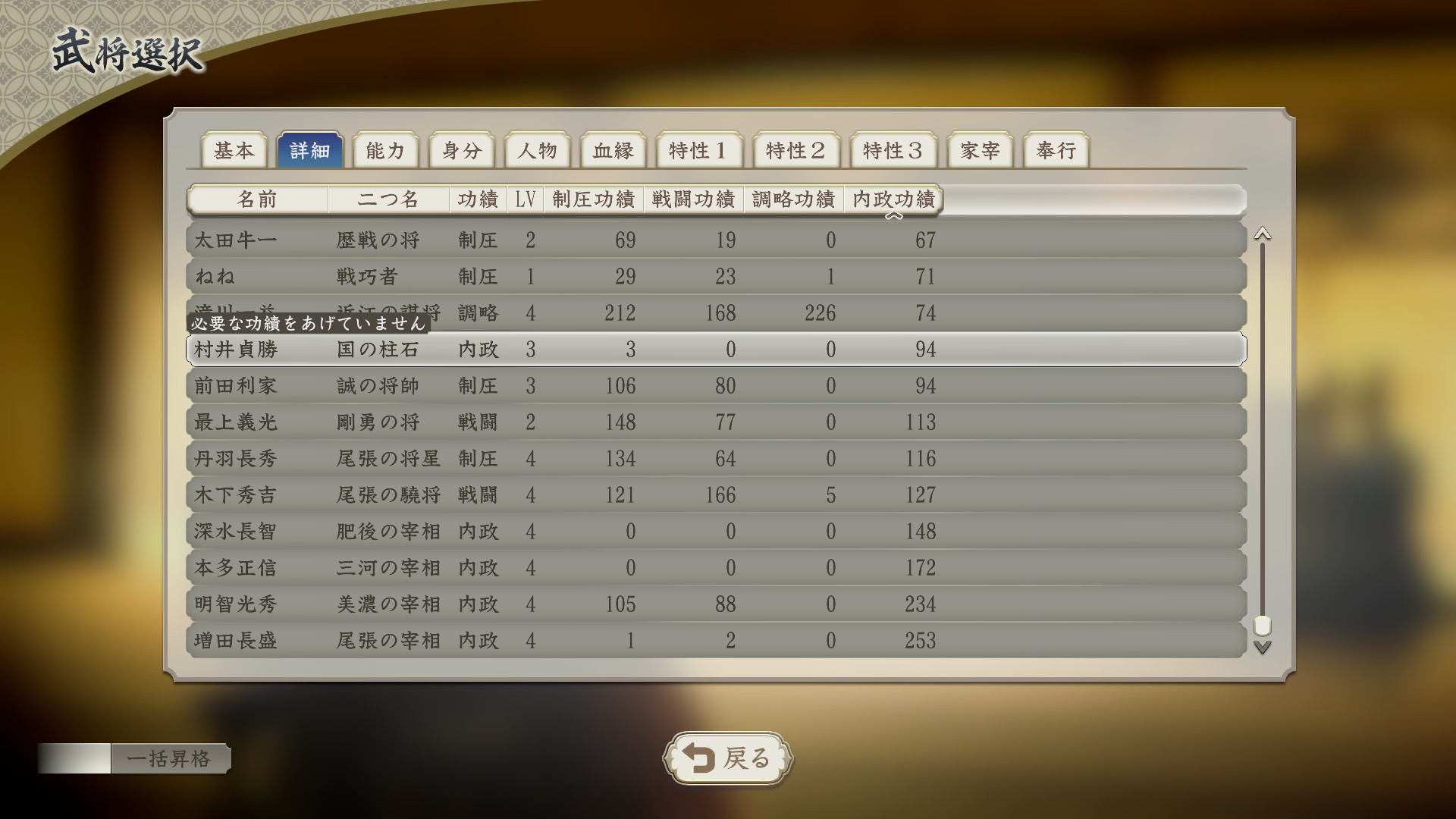 武将としてはそれなりだが、「暗躍」持ちなので一益配下で調略功績を積んで信長配下にまわしてクールタイム短縮+能力アップ要員にすればよかったと気づくのもわりと後半だったので悔やまれる。
