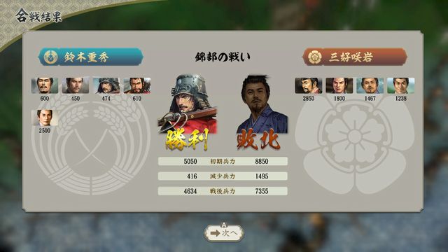 勝利すれば高屋城を包囲でき、5月中なら城主の三好咲岩が降伏して早期攻略でき、登用もできる。
