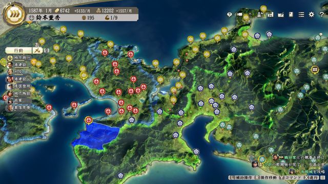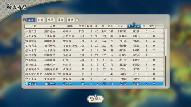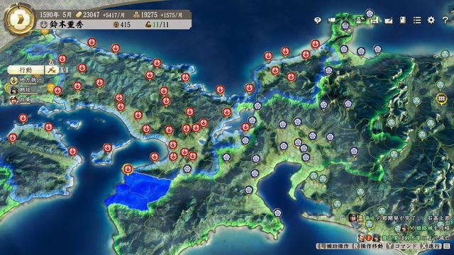 勢力の西側に本拠が寄っており統治範囲外の城が多めになるため豊臣の金銭収入は普段よりやや少ない。