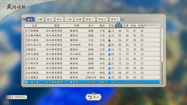 鈴木と織田を合わせればなんとか豊臣に対抗できそうな勢力だが、自分で勢力を一つも滅ぼしていないため鈴木の武将が少ない。