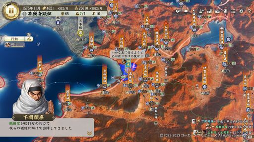 なるべく早く三好家の本拠地である岸和田城を攻撃しましょう。威風の発動で、部下の忠誠up+東四国をタダで占領できればその流れで毛利家・宇喜多家に侵攻。鳥取城を取るまでには織田家との臣従関係が同盟関係に格上げされるので、全力で親密度を100にします。この時、同盟関係中に100にならなそうであれば同盟を延長してでも「同盟中に親密度を100にする」ことにこだわると良いでしょう。顕如の息子、教如が元服しているはずなので織田家の誰かと結婚できるはずです。速攻で婚姻同盟を結びます。