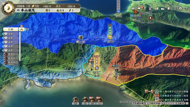 勢力として選べる最初のシナリオとなる徳川家。北には強力な同盟国である織田がおり、他のシナリオで脅威となる武田もここでは間もなくイベントで同盟できるなど外交面は万全。