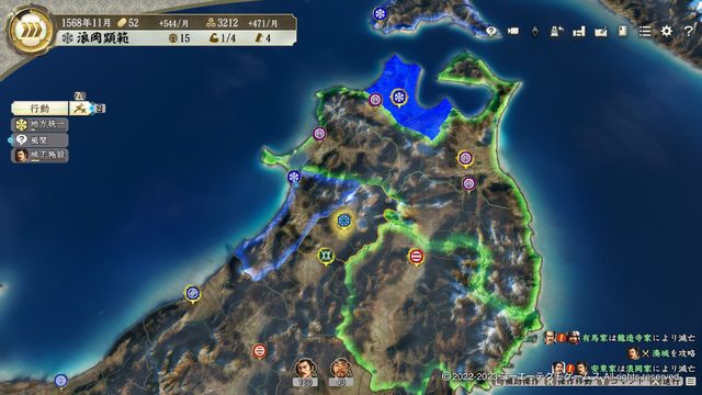 ここまで来ればそこそこの武将数に蠣崎親子・安東愛季など有能な武将も加わるので、じっくり国力を高めていこう。