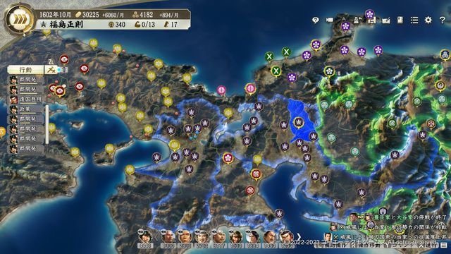 ただし徳川が70城まで増える一方で豊臣は11城まで減り、早期に徳川が全国の過半を制するため中盤以降は難し目。
