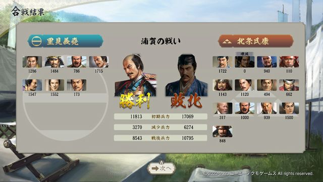 スタート直前に、可能な限り小田原城の市を掌握しましょう。4か月ほど経つと、河越城の戦いが始まります。この合戦は画面の指示に従うようにすれば、基本的に負けません。但し、上杉憲政の部隊は上下から挟み撃ちにしてあげると戦いがスムーズに進むはずです。