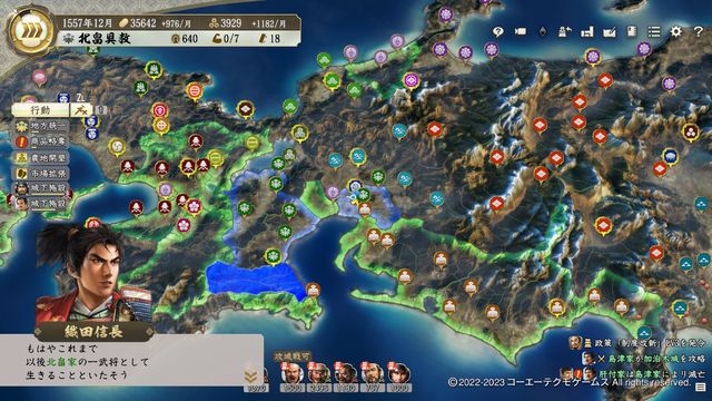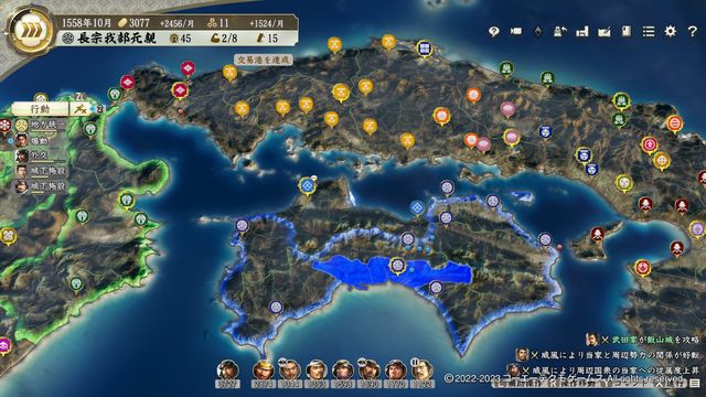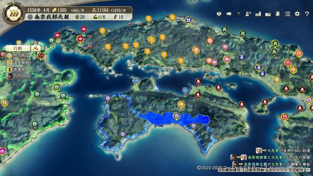序盤から城を減らしていったため毛利の政策が少なく収支黒字で留まり政策解除されないことが多い。