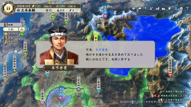 1城の状態で尾張斯波を滅ぼすと、運も絡むが領内に木下秀吉が留まっていれば仕官が発生する。