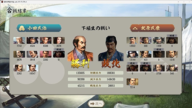 北条戦はかなりきつい。伊達一族に佐竹義重などの名将で将の質では勝てているが、兵力差が圧倒的なのでしっかり戦略を練らないと普通に負けるので注意。