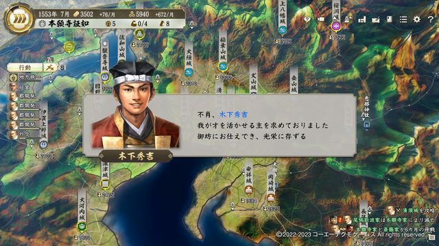 1城の状態で尾張斯波を滅ぼすと、運も絡むが領内に木下秀吉が留まっていれば仕官が発生する。