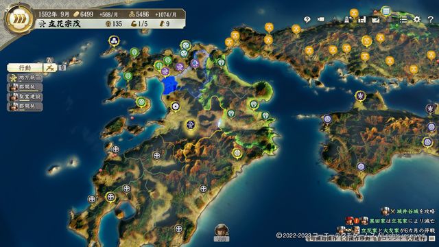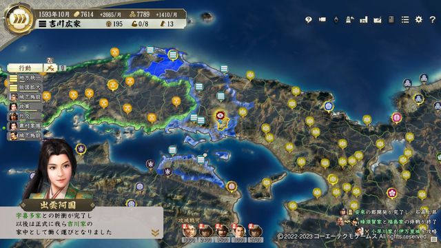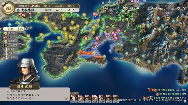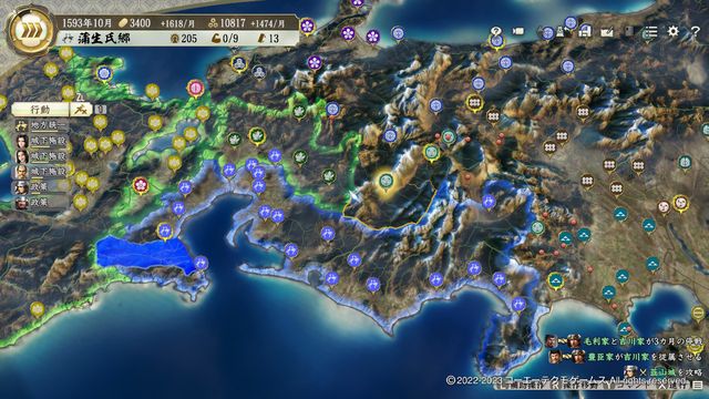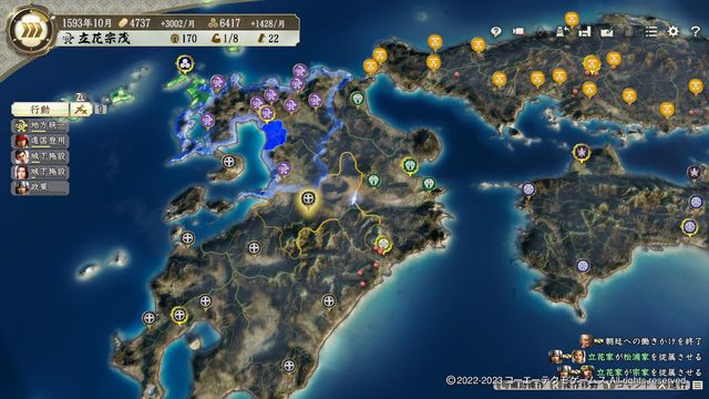 小早川は制度改新・弐の発令が早いので、動揺が回復するくらいで残り2城を攻城戦で攻略。