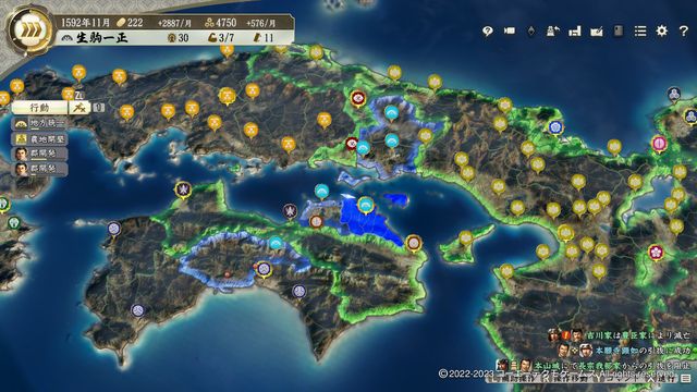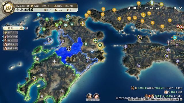 しかし、北に鍋島・東に小早川・南に加藤がおり、特に小早川とはCPU担当だと初手で滅ぼされるほどの差がある。