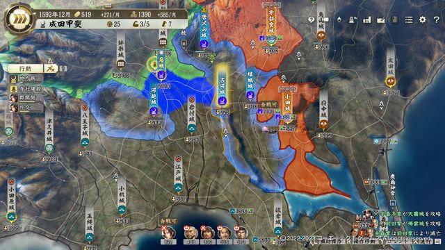 周囲を見渡すと成田・佐野と1城大名がいるため、滅ぼしていきたくなるが、実際に攻め込むと上田・箕輪・国峯と3城で隣接扱いの徳川家が間違いなく攻めてくる
