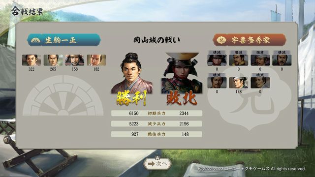 上級以上では北方の小早川が初手で立花を攻撃することが多く、ギリギリで滅ぼすか瀕死に追い込んで敗退する。