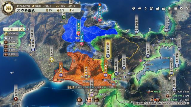 攻略例では威風中+本拠での攻城戦で四国の勝瑞城1城まで追い込んだが、そこまで拡大していない場合はそれで滅ぶ。