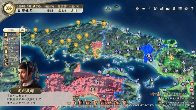 注意点としては府内館が毛利と隣接しているため、城を空にすると毛利の進軍を誘発することがあること、赤忠誠だと引き抜き工作をされることぐらいだろう