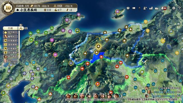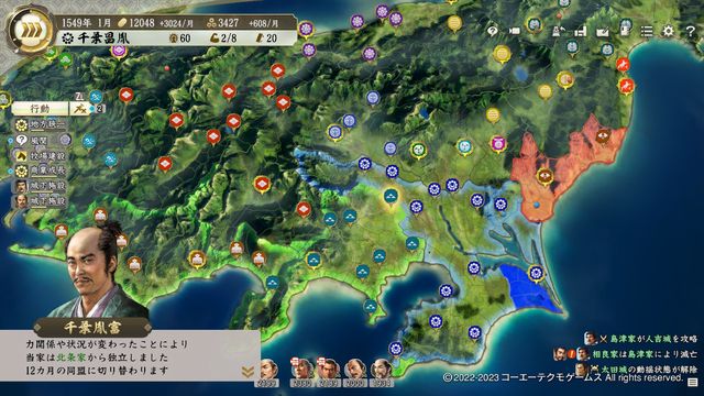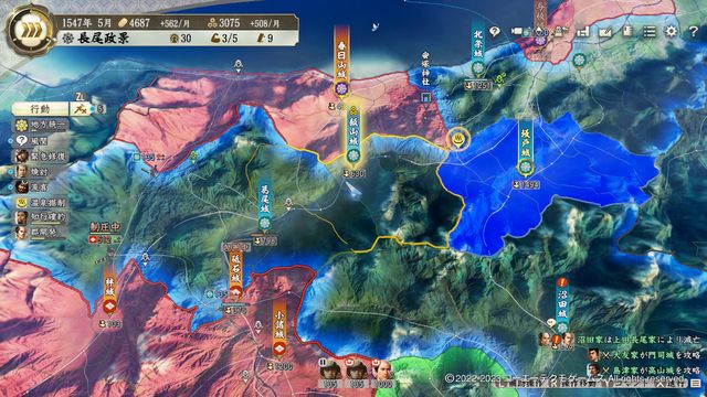 開幕に分割出陣を活用して7部隊出せばいきなり威風大合戦が可能で、勝利で一気に4城が寝返る。