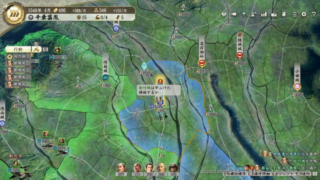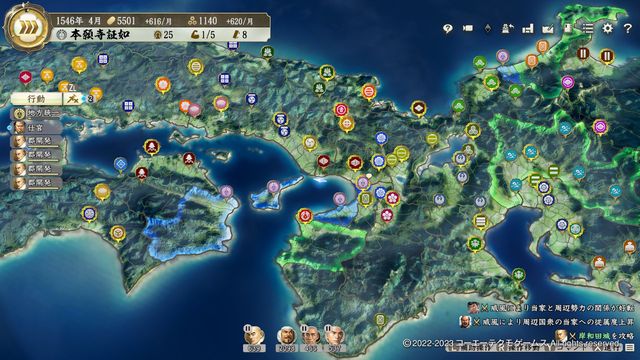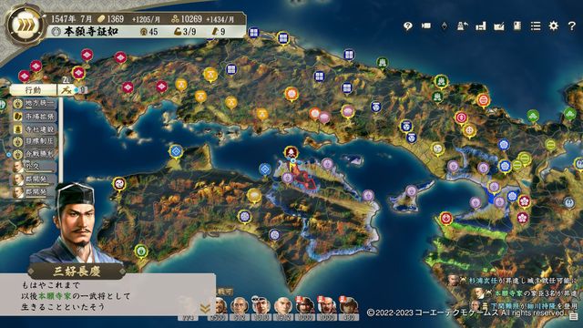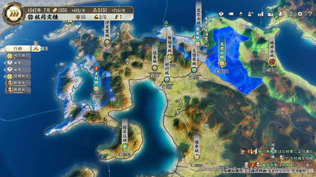 本シナリオでは三好がまだそこまで大きくなく、本拠が南隣の岸和田城で早々に制度改新・弐を発令する。