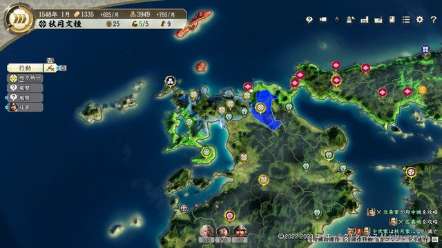大友・毛利・尼子と比較的大きな勢力と隣接しており、武将の質も高くないため、拡大方針をしっかり立てておかないと後々大変なことになる