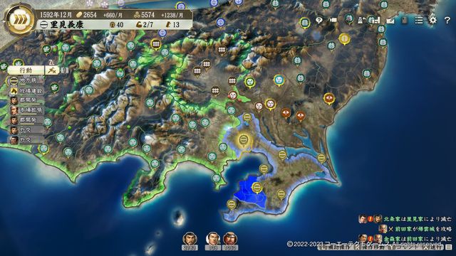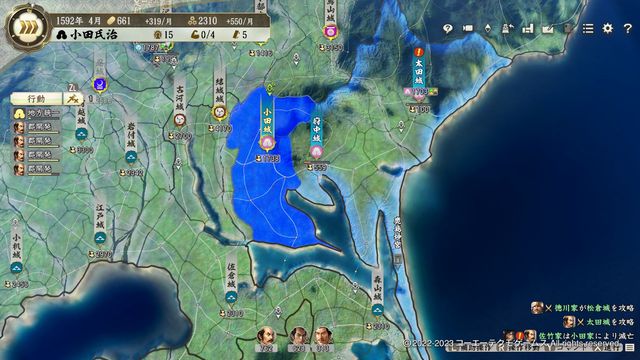 海を渡ると戦場の地形が良くないため北条との決戦はほぼ勝ち目がないうえ、三崎城で徳川と隣接してしまう。