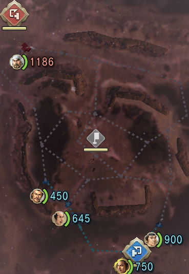 | 攻略 | 陣地の反対側には三叉路が多い。そこに敵を誘導し挟撃していきたい。 敵が1部隊の場合、退き口のとなりの中継点に侵入すると退き口に戻って動かなくなる。 そこに侵入しない限り近い味方部隊に向かっていくので、うまく誘導すると退き口破壊で勝利できる。 身も蓋もないが、写真の例の場合だと上の部隊を狙うので上の部隊を左に動かすと敵も直進後右に曲がる。 それを確認して上の部隊を初期位置経由で退き口に向かわせると、退き口→味方→敵の状態になる。 そうなると敵はその部隊を撃破しない限り退き口に戻れなくなるので、もう一部隊で退き口を攻撃し放題になる。 |
